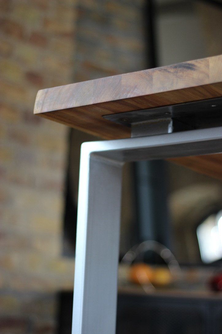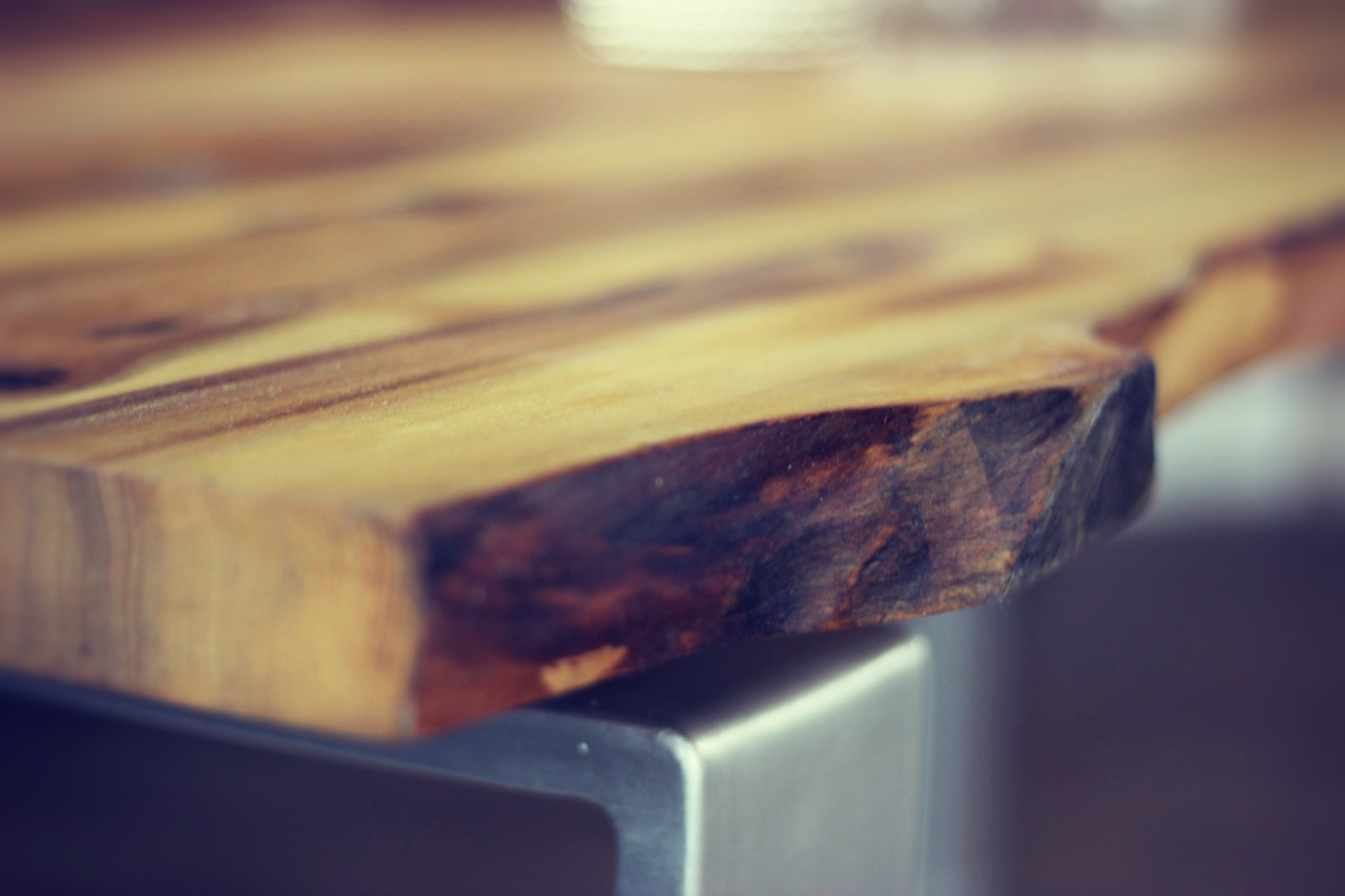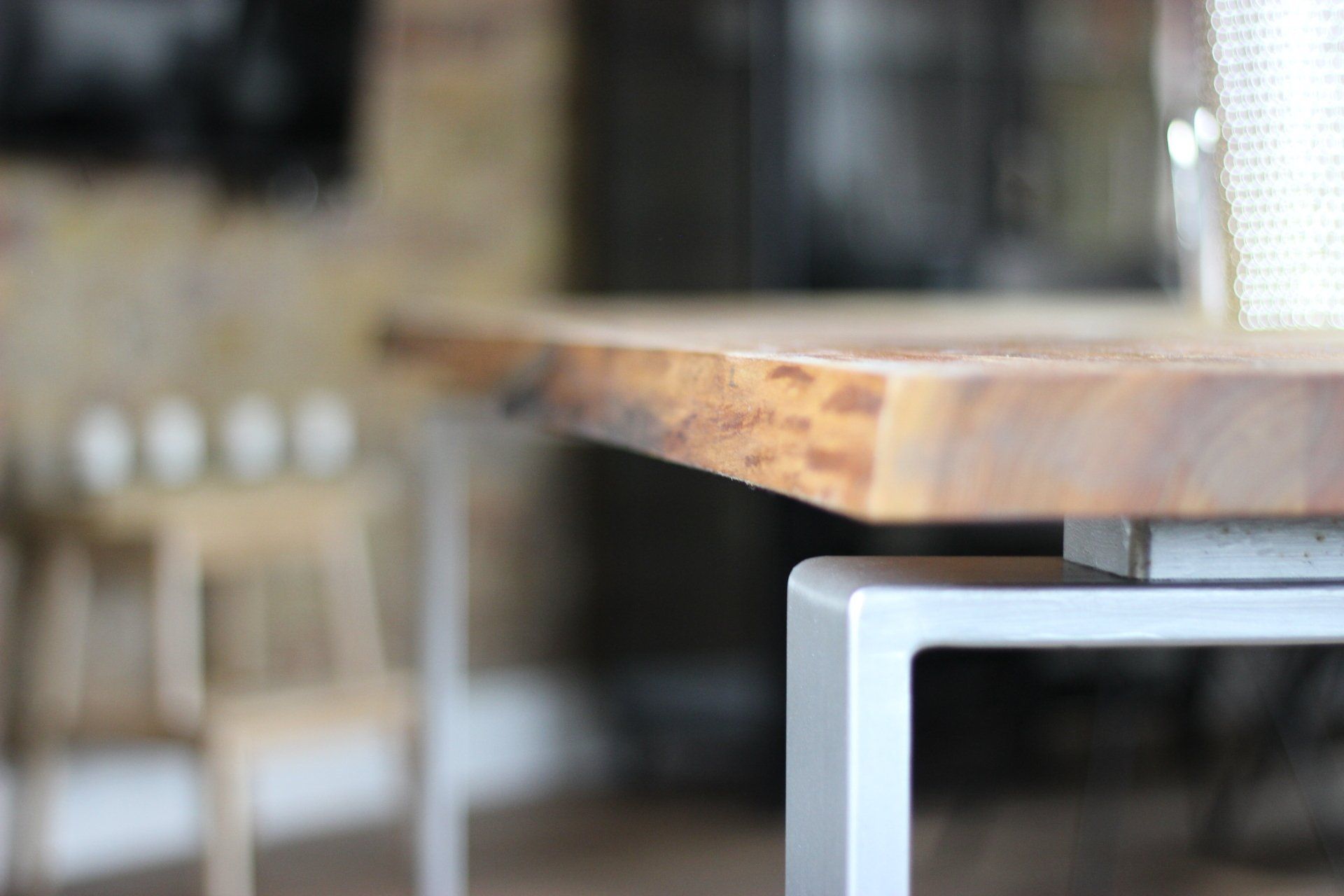 Aby uzyskać lekkość stołu o dużych wymiarach, zastosowalismy dystans pomiędzy stalowymi nogami a powierzchnią drewnianą. Nadaje im to całkowicie nowy, niespotykany charakter.