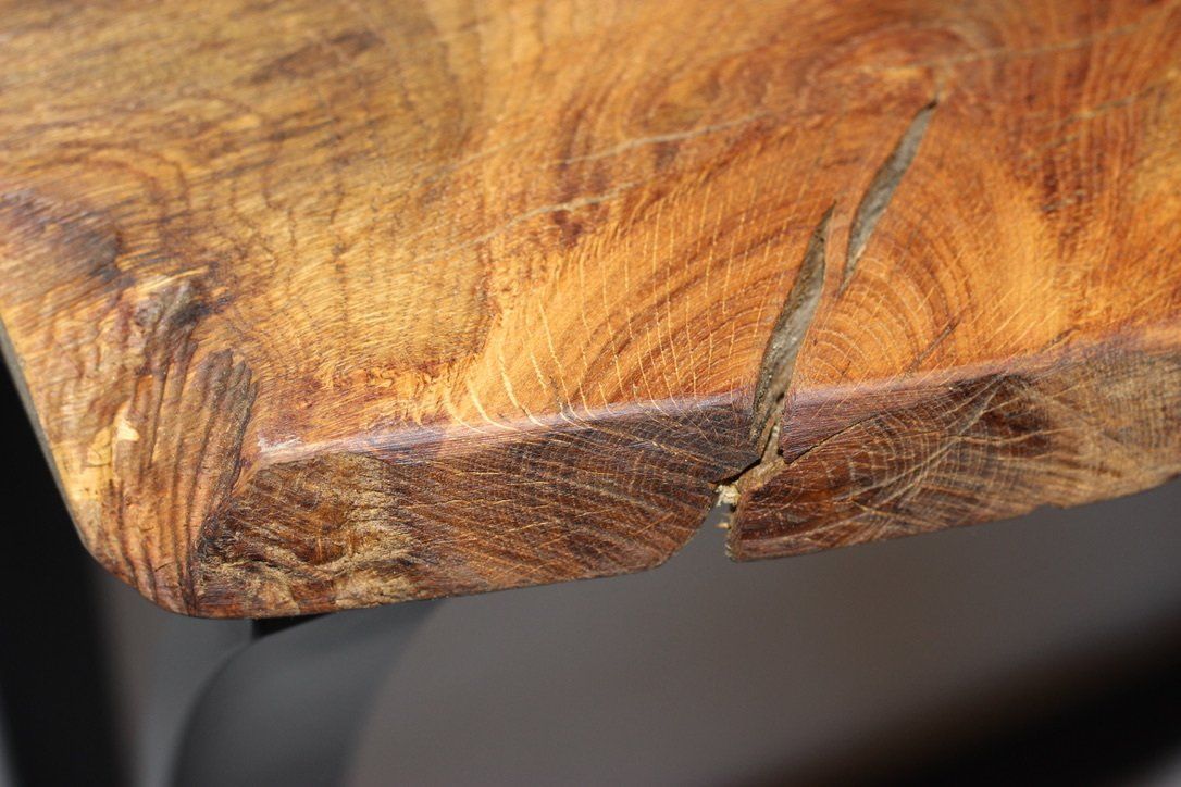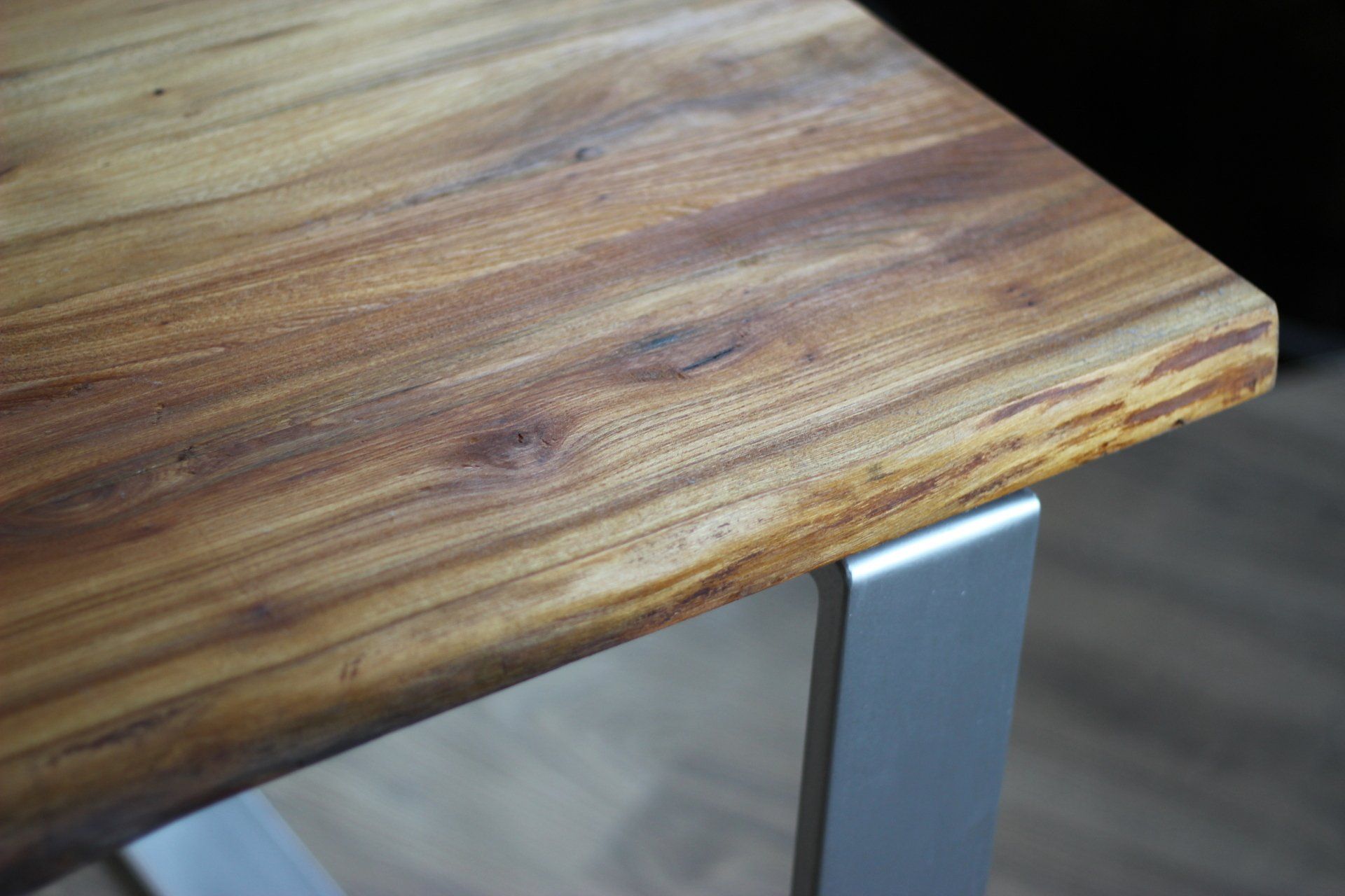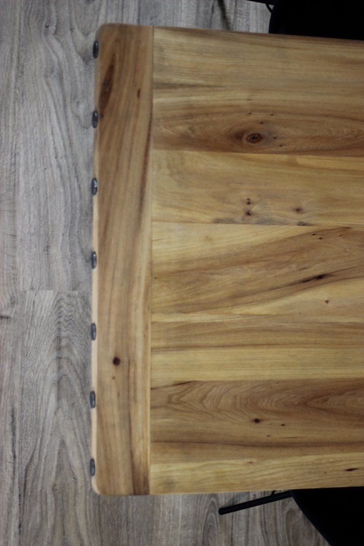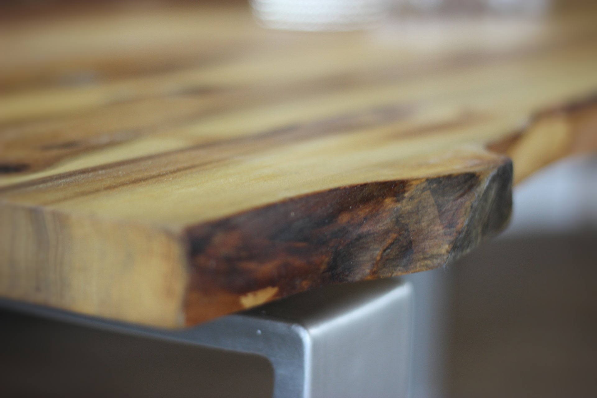Aby uzyskać lekkość stołu o dużych wymiarach, zastosowalismy dystans pomiędzy stalowymi nogami a powierzchnią drewnianą. Nadaje im to całkowicie nowy, niespotykany charakter.